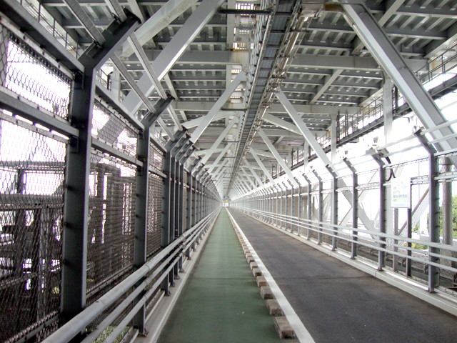 そう、この橋はトラスの内部に自歩道があります(歩行・自転車・原付(二種まで)専用)
