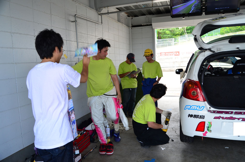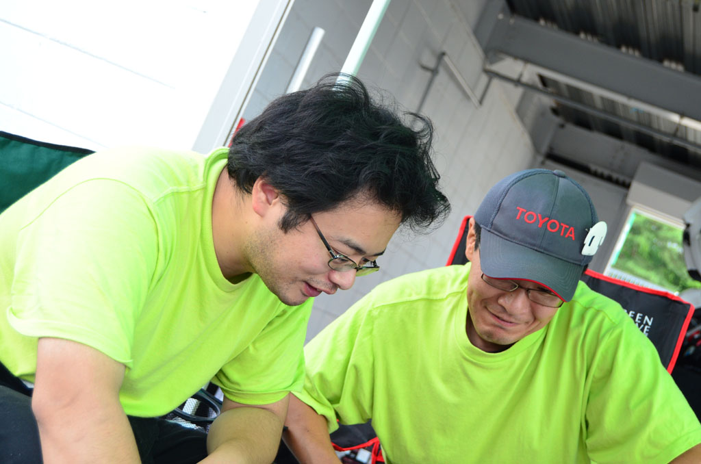 E/Gオイル交換、ブレーキフルードのエア抜き、タイム計測器の固定等、着々と準備を進めていくスタッフ達。