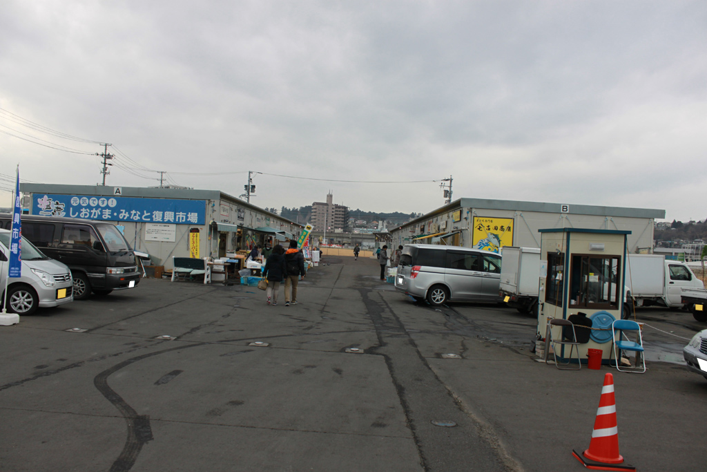間に駐車場があって、復興市場となります。