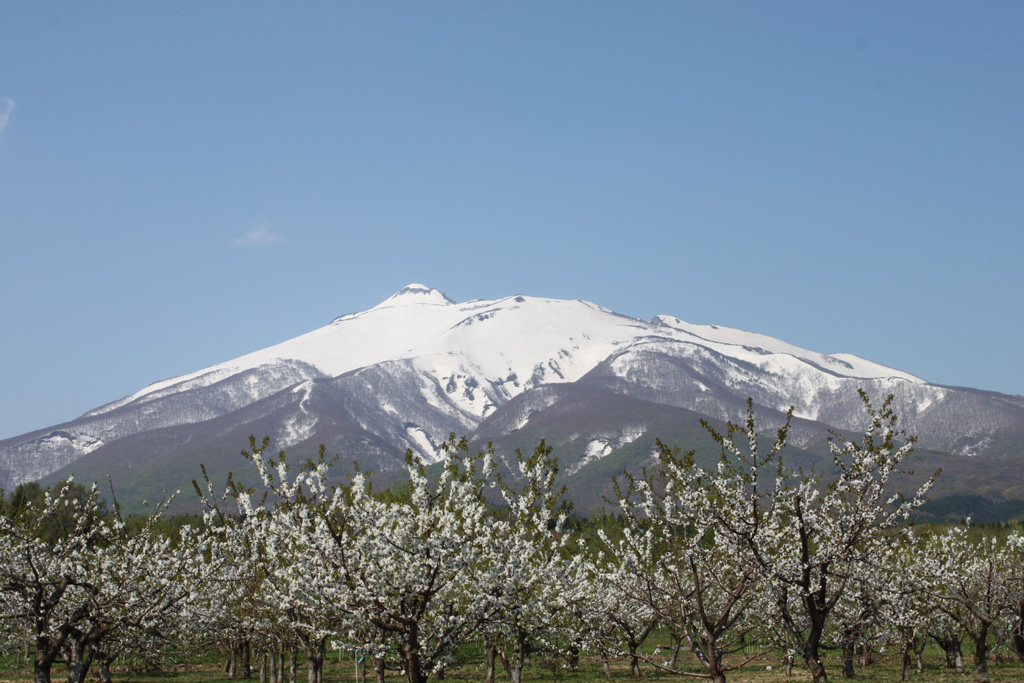 満開のリンゴの花と岩木山を眺めて…。